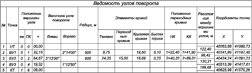 Рис. 14. Пример ведомости углов поворотов, прямых и кривых трассы