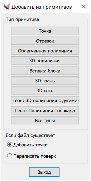 • примитивы (точки, 3D-полилинии, блоки, 3D-грани, 3D-сеть и т.д.);