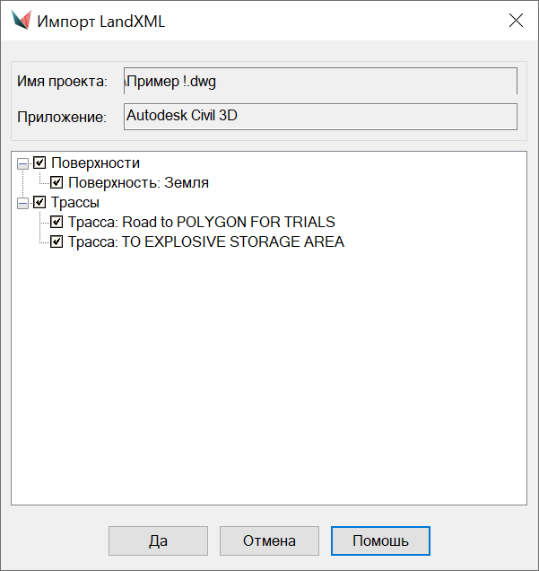 • файлы LandXML, содержащие группы геоточек, поверхности, планы и профили трасс.