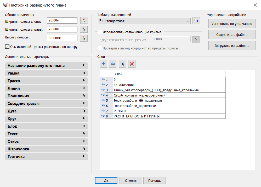 Для создания продольного профиля автомобильной дороги на незастроенной территории зачастую требуется ситуационный план, то есть развернутый план трассы и ситуация местности. В nanoCAD GeoniCS он формируется с помощью команды Создать развернутый план трассы из раздела Утилиты окна профиля. Суть работы алгоритма создания развернутого плана заключается в следующем. Запрашиваются ширины полос для отбора объектов справа и слева от трассы. Далее вокруг трассы создается буферная зона, по которой отбираются все объекты, которые могут быть обработаны, и находящиеся на слоях из списка (рис. 21).