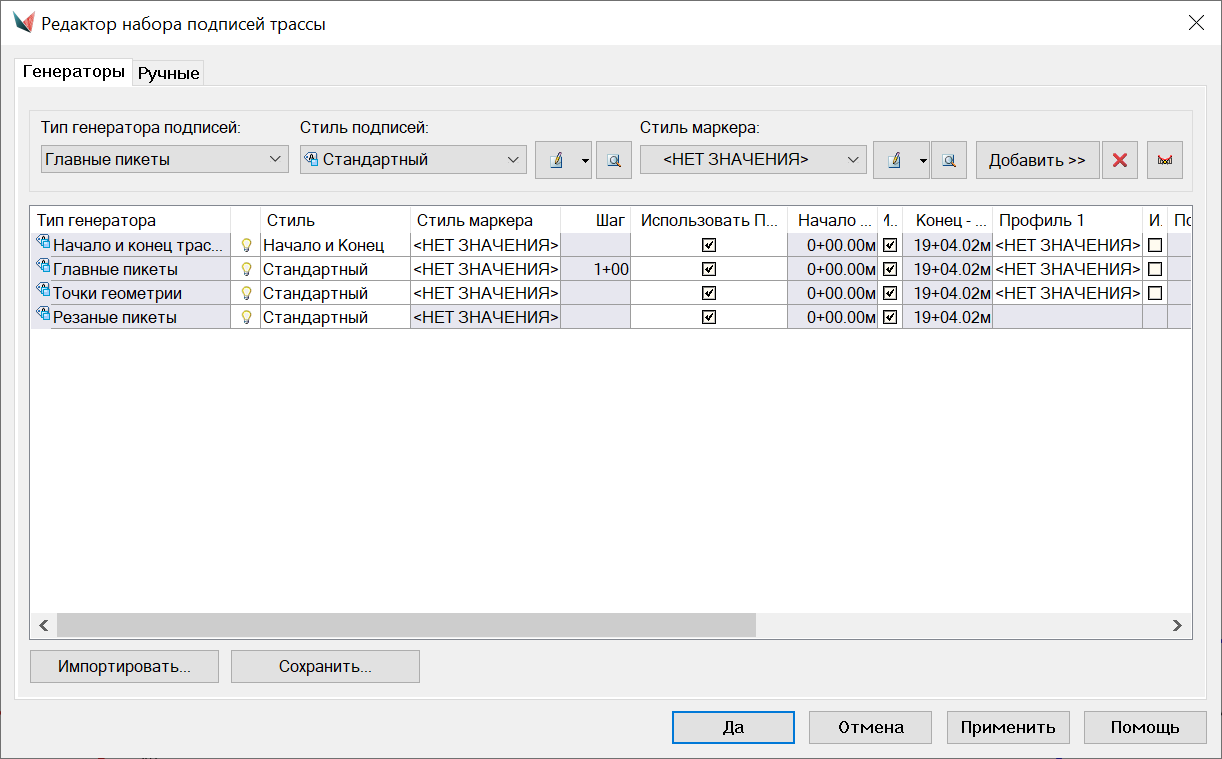 В наборе подписей трассы задаются стиль отображения подписей пикетов, а также вставка обозначений в начале и в конце круговых и переходных кривых. Для примера (рис. 8) был взят набор подписей «Стандартный», входящий в настройки стандартного шаблона nanoCAD GeoniCS.