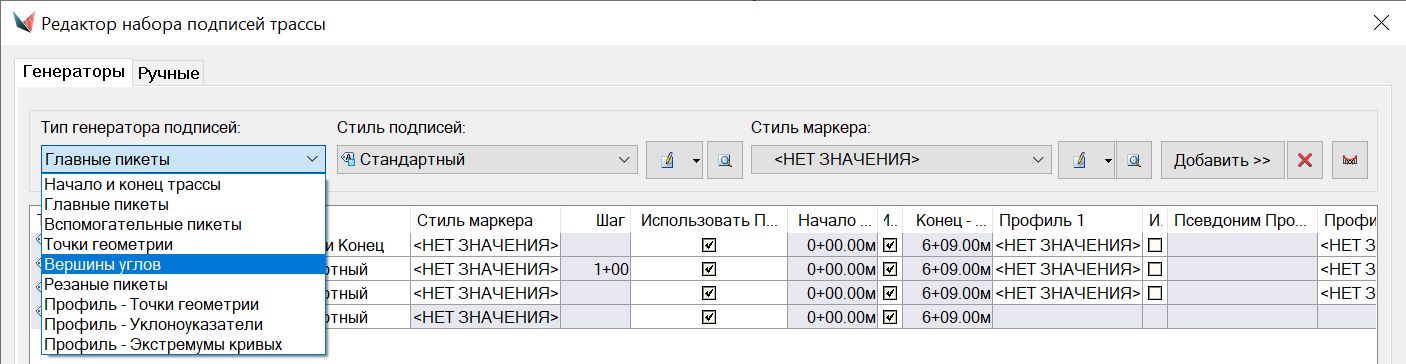 Предположим, пользователю необходимо обозначить подписью вершины углов поворота трассы. nanoCAD GeoniCS позволяет выполнить подписывание трасс автоматически (с помощью генератора подписей) или вручную. В генераторе подписей выбирается соответствующий тип подписи («Вершины углов»), а затем указывается стиль подписи – либо он создается в соответствии с принятым оформлением вершин трассы на плане. После этого настроенная подпись добавляется в существующий набор подписей трассы.