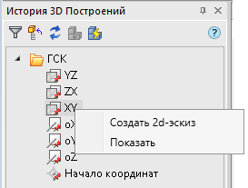 В этой панели указываем плоскость XY и, нажав правую кнопку мыши, выбираем Создать 2d эскиз (рис. 1).