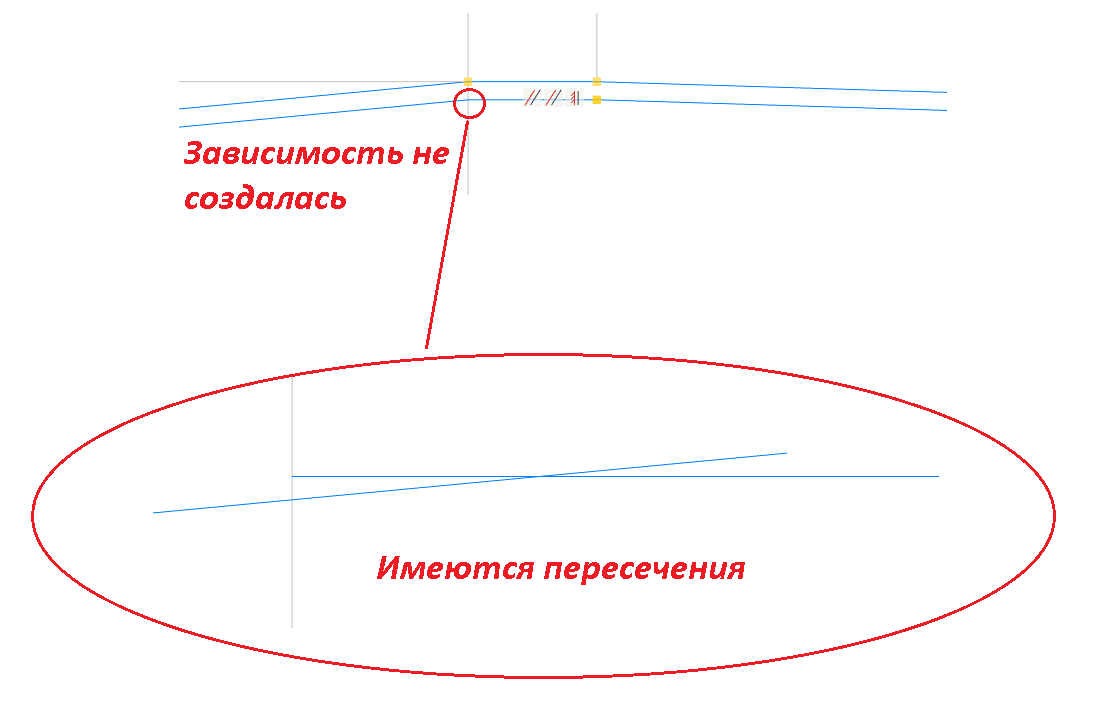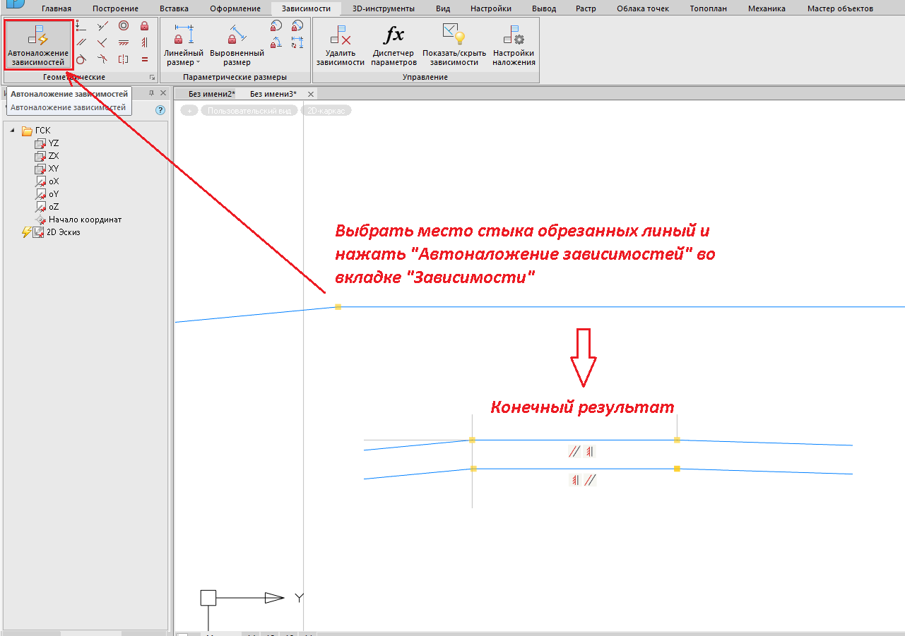 После обрезки в месте стыка двух линий нужно наложить зависимость – как уже сказано, эта операция выполняется вручную. Выделяем пересечения, открываем вкладку Зависимости и указываем на место стыка обрезанных линий (рис. 15).