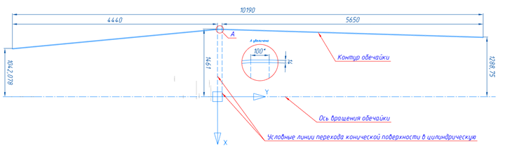 Условная линия перехода конической части обечайки размером 4440 мм проходит через начало координат.