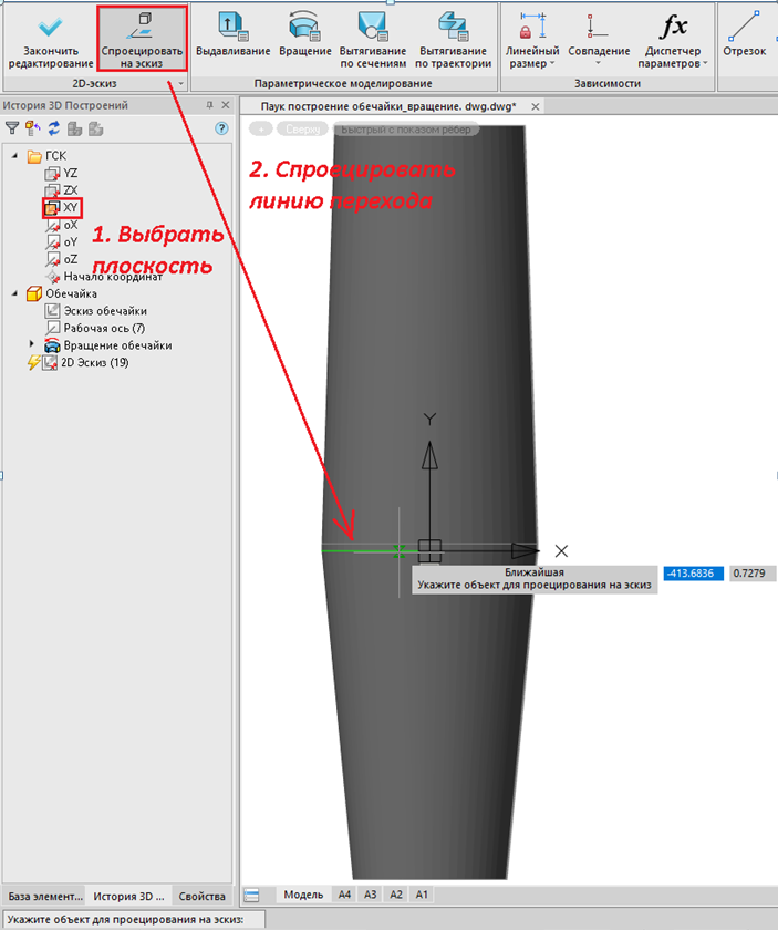 На плоскость YX нужно спроецировать линию перехода – она будет базовой линией для построения эскиза основания «Паука».