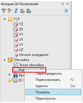 Примечание. Чтобы построить точки на центральной линии, совпадающей с осью oY, нужно в Истории 3D построений включить видимость оси вращения обечайки, если до этого ось была скрыта (рис. 28).
