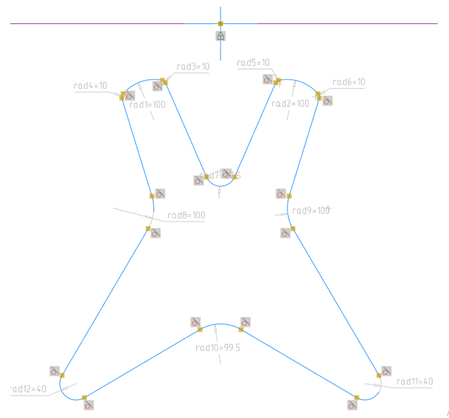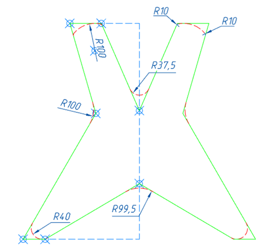 Ориентируясь на размеры, показанные на рис. 33, аналогичным способом строим сопряжения радиусами: 37,5; 99,5 и сопряжение с боковой частью эскиза R100. Результат представлен на рис. 39.