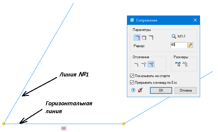 Вводим значение радиуса 40, нажимаем OK (рис. 35), после чего указываем в левом углу наклонную линию №1 и горизонтальную линию. Нажимаем Enter.