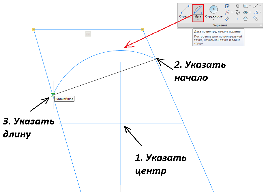 Рис. 40. Построение объекта «Дуга по центру, началу и длине»