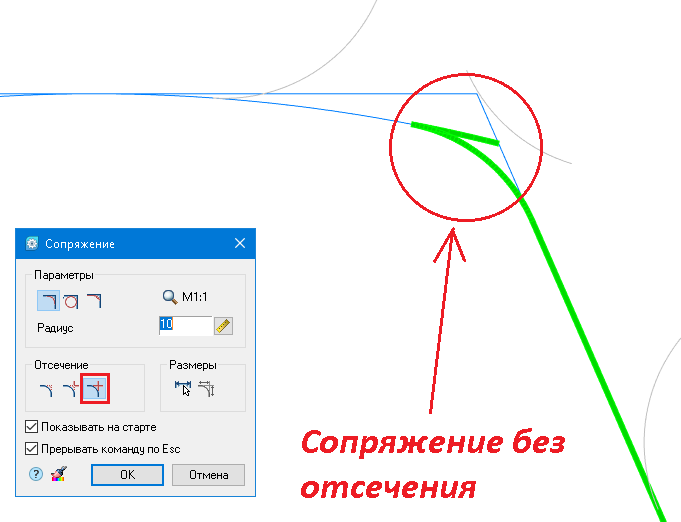 Примечание. При построении возможна ситуация, показанная на рис. 42. Проблему можно решить так: в меню Отсечение открыть диалог Сопряжение и выбрать Без отсечения.