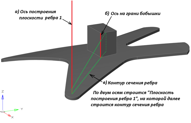 Для создания эскизов ребер необходимо построить ограничивающие линии, которые будут задавать траекторию вытягивания ребра, а также обозначить контур и задать размеры будущего ребра.