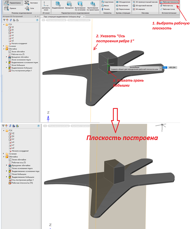Ребра будут строиться с помощью инструмента Вытягивание по сечениям. Но для начала нужно построить дополнительную вспомогательную геометрию.