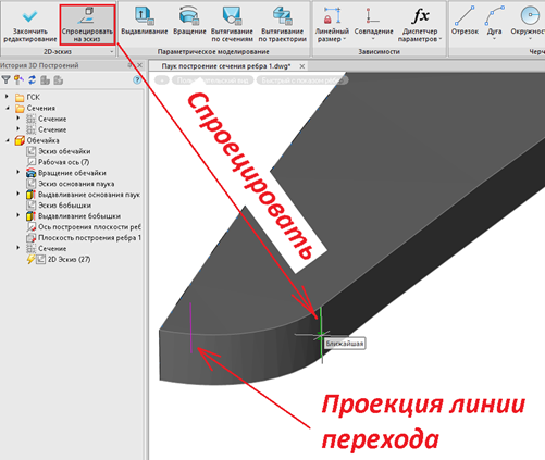 Далее нужно спроецировать геометрию, чтобы привязать к ней построение эскиза: