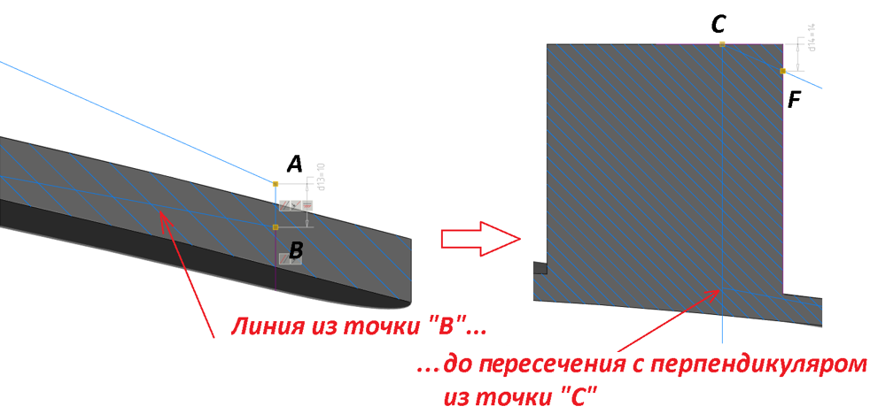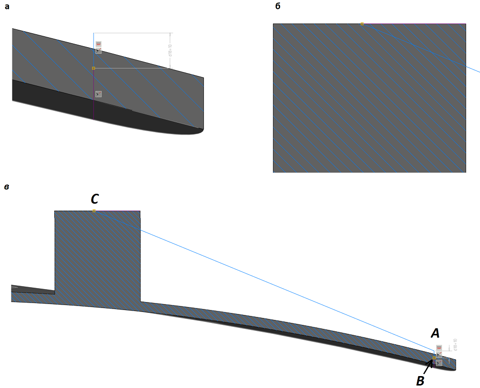От спроецированной линии перехода на луче (рис. 64a) строим отрезок высотой 10 мм, а от верхней точки отрезка – наклонную линию до горизонтальной проекции грани бобышки (рис. 64б). Накладываем автозависимости. Для удобства изложения всем точкам задаются буквенные обозначения (рис. 64в).