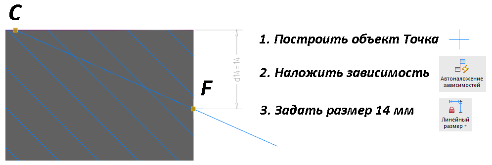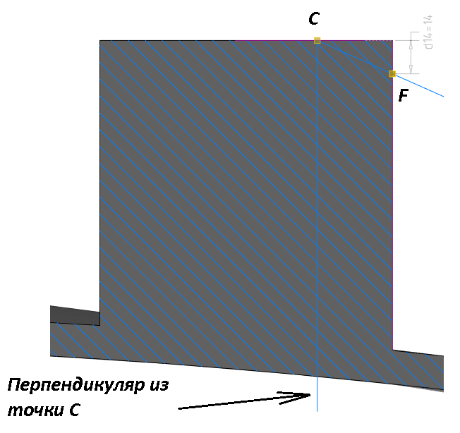 От точки F до спроецированной верхней горизонтальной грани откладываем 14 мм (см. рис. 65). Выбираем Зависимости → Линейный размер, указываем верхнюю горизонтальную грань, а затем точку и задаем значение 14 мм.