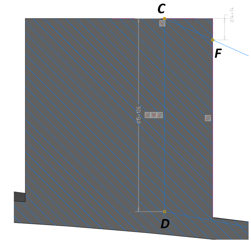 Далее нужно обрезать лишний «хвост» у перпендикуляра и применить автоналожение зависимостей. Полученное пересечение даст точку D. От точки D горизонтальной проекции бобышки устанавливаем размер 126 мм (рис. 68).