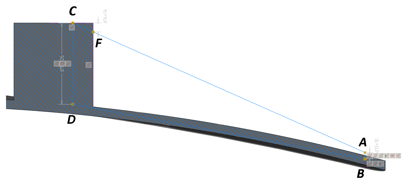 Примечание. Построенная фигура ABDСF показывает контур сечения ребра. Нижняя направляющая должна располагаться в теле основания «Паука», поэтому размер CD задан таким образом, чтобы эта направляющая не выходила за пределы объекта. Размер 126 мм как раз и обеспечивает такое положение направляющей.
