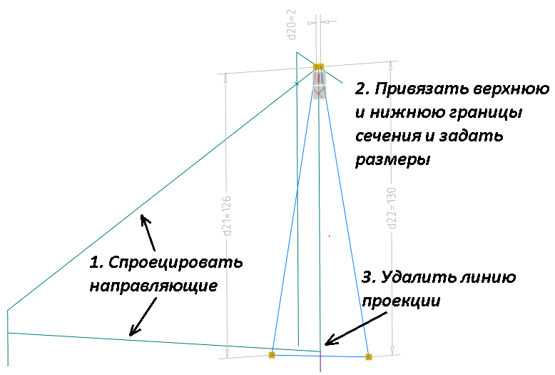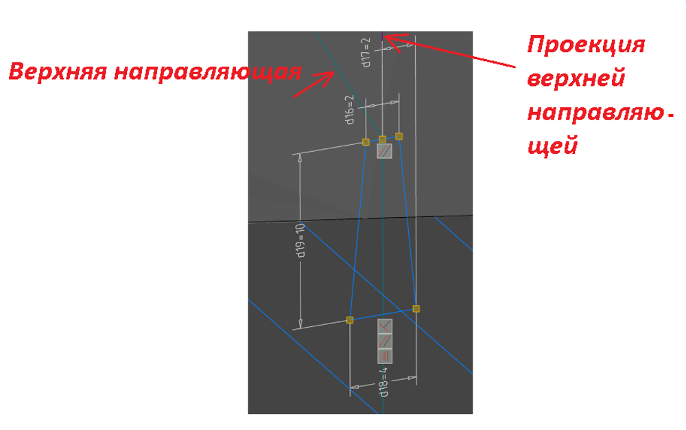 Верхняя граница сечения привязана к точке A автоматически наложенной зависимостью. Чтобы зависимость создалась, нужно спроецировать верхнюю направляющую, а затем применить наложение зависимостей.