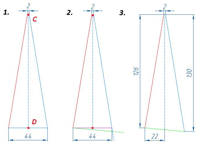 | Построить фигуру 1, задать размеры. | 1) Из левой нижней точки провести вправо и вниз наклонную под произвольным углом – как показано на фигуре 2. 2) Фиолетовую линию удалить. | 1) Красную линию продлить до пересечения с зеленой. 2) Лишнее обрезать. 3) Применить автоналожение зависимостей, задать размеры как на фигуре 3. |