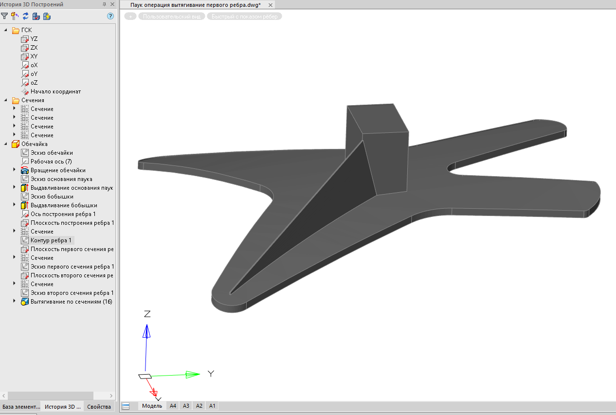 - контролировать нахождение ребра в теле основания «Паука». Форма основания сферическая, а инструмент Вытягивание по сечениям работает по прямой траектории, поэтому есть риск выхода нижней части ребра за нижние пределы тела;