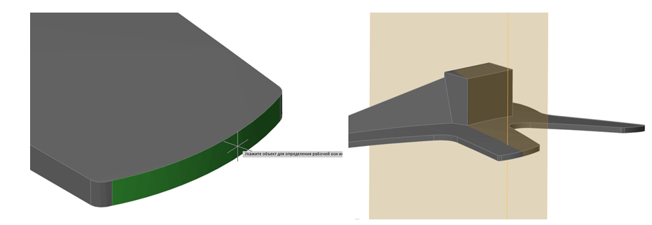 Создаем ось на концентричной части луча. Через ось и ребро бобышки строим плоскость построения ребра 2 (рис. 82).