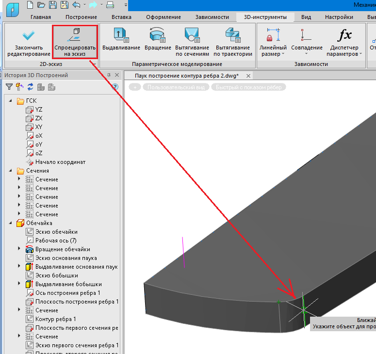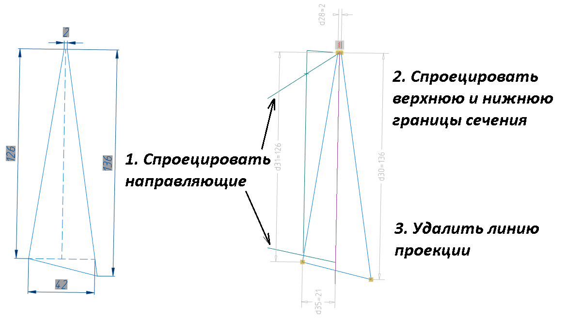 Примечание. Если линии проекций пересекают при построении эскиза его замкнутый контур, то по завершении построения такие линии лучше удалить – из-за них операция Вытягивание может не сработать должным образом.