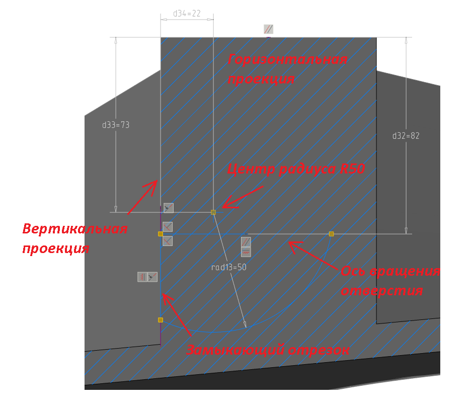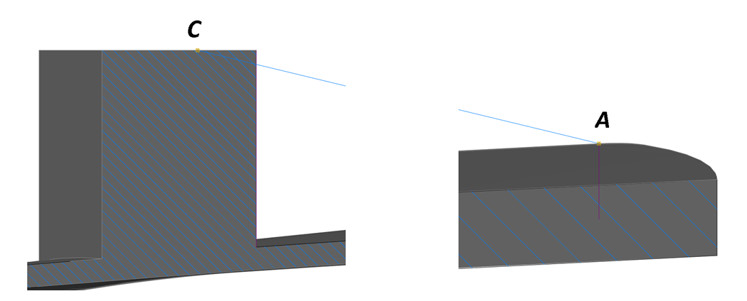 Как и при построении первого ребра, из вершины спроецированной линии перехода проводим прямую до пересечения с горизонтальной проекцией грани бобышки. Применяем автоналожение зависимостей. Полученным точкам присваиваем обозначения А и С.