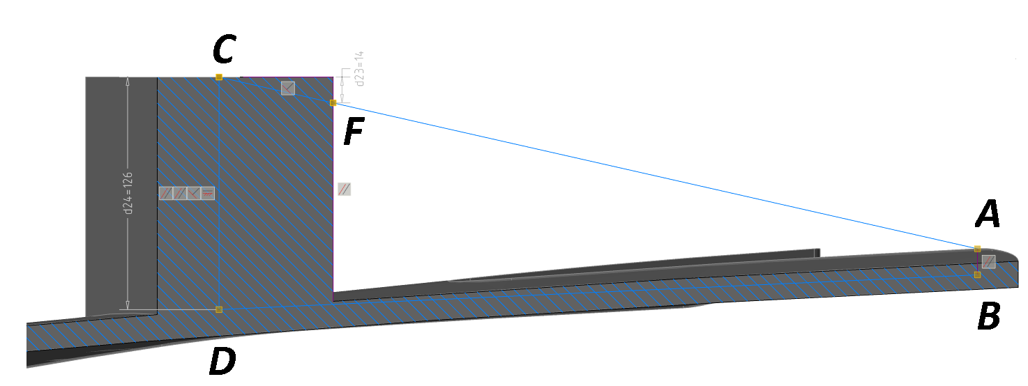 Из нижней точки проекции линии перехода на луче (точка B) проводим прямую до пересечения с перпендикуляром и строим точку D. Применяем автоналожение зависимостей; задаем размеры так, как показано на рис. 87.Рис. 87. Контур сечения ребра 2