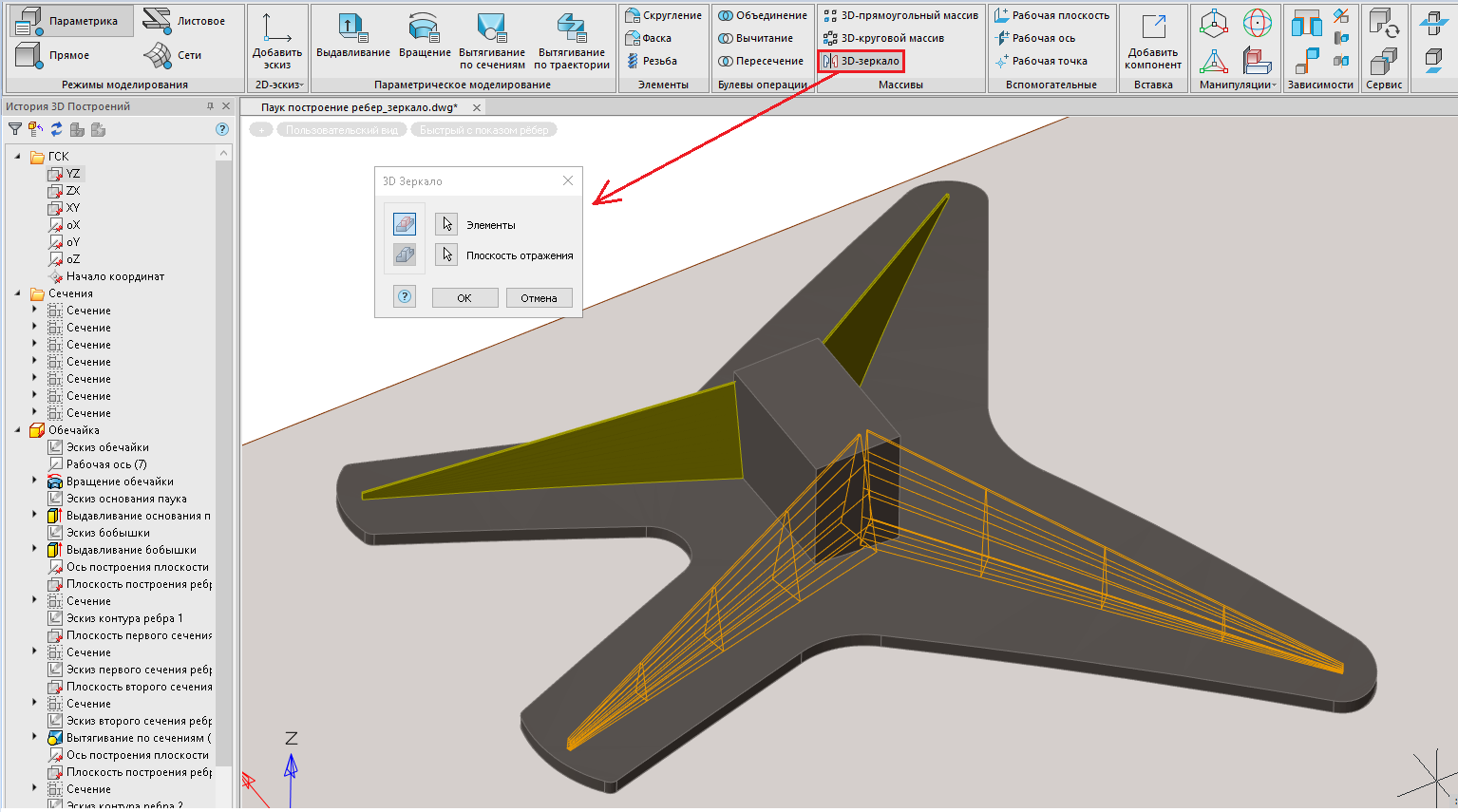 На рис. 91 показаны два построенных ребра. Ребра второй половины детали построим с помощью инструмента «Зеркало» (рис. 92).