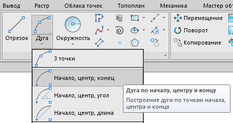 Далее требуется построить дугу (рис. 94). Выбираем Построение → Дуга (тип дуги: «Начало, центр, конец»). В качестве начала указываем вертикальную проекцию грани, центром будет построенная точка, конец – ось вращения.