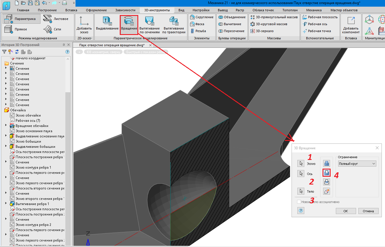 Применяем к эскизу команду Вращение (рис. 96). Выбираем 3D-инструменты → Вращение, последовательно указываем эскиз и ось. Выбрав тело, указываем на бобышку и используем команду Вырезать.