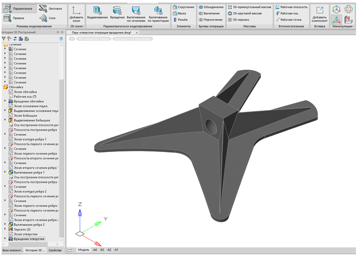 Чтобы завершить моделирование детали «Паук», нужно создать глухое овальное отверстие в бобышке.