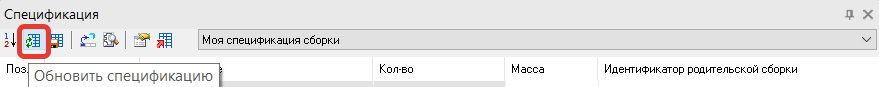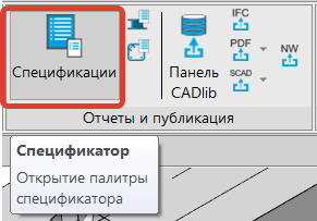 Вызовем панель Спецификатора через команду Спецификатор (URS_SPECIFICATION_PALETTE) или нажатием на кнопку Спецификации на панели инструментов (рис. 1).