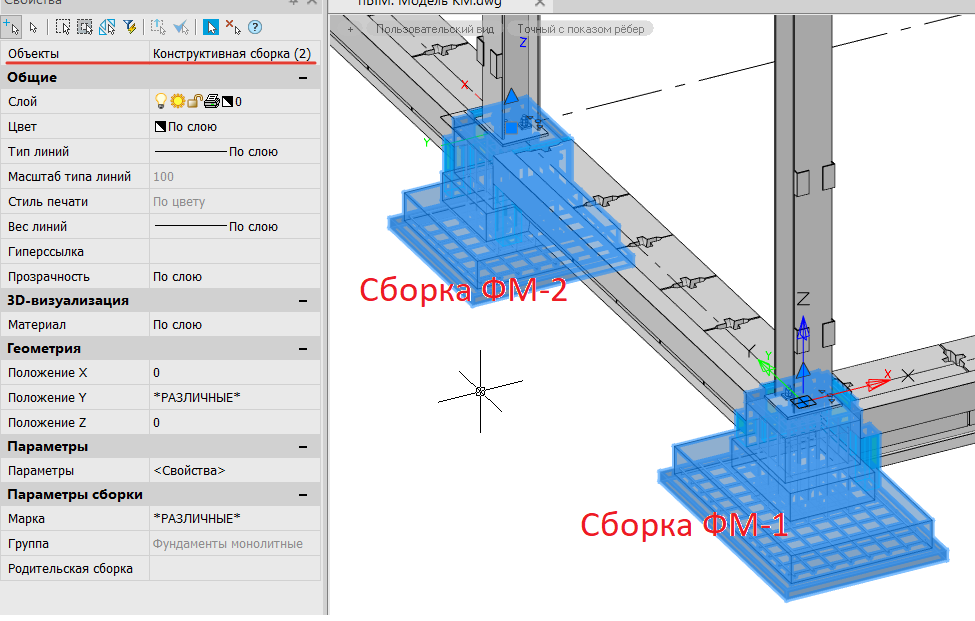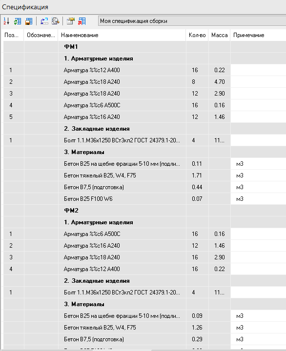 Данная спецификация составлена для конструктивных сборок фундамента в модели. Конструктивные сборки расположены на осях А1 и Б1 (рис. 4).