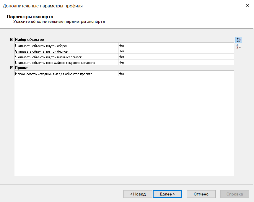 В окне Дополнительные параметры профиля (рис. 7) можно настроить опциональные параметры экспорта для объектов чертежа. Не меняем эти настройки и нажимаем Далее.