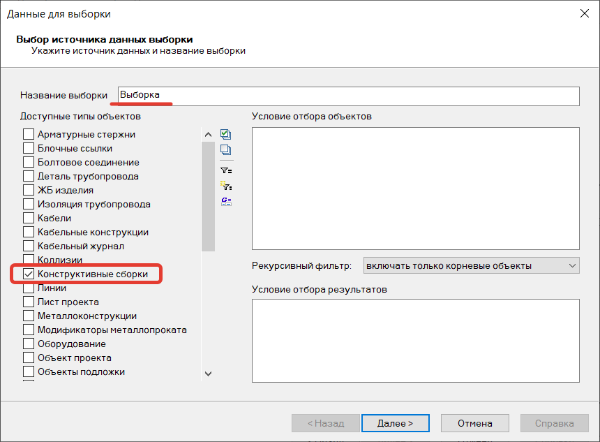 - Доступные типы объектов – это «грубый» фильтр, который определяет, какие виды объектов попадут в спецификацию. Выберем пункт Конструктивные сборки;