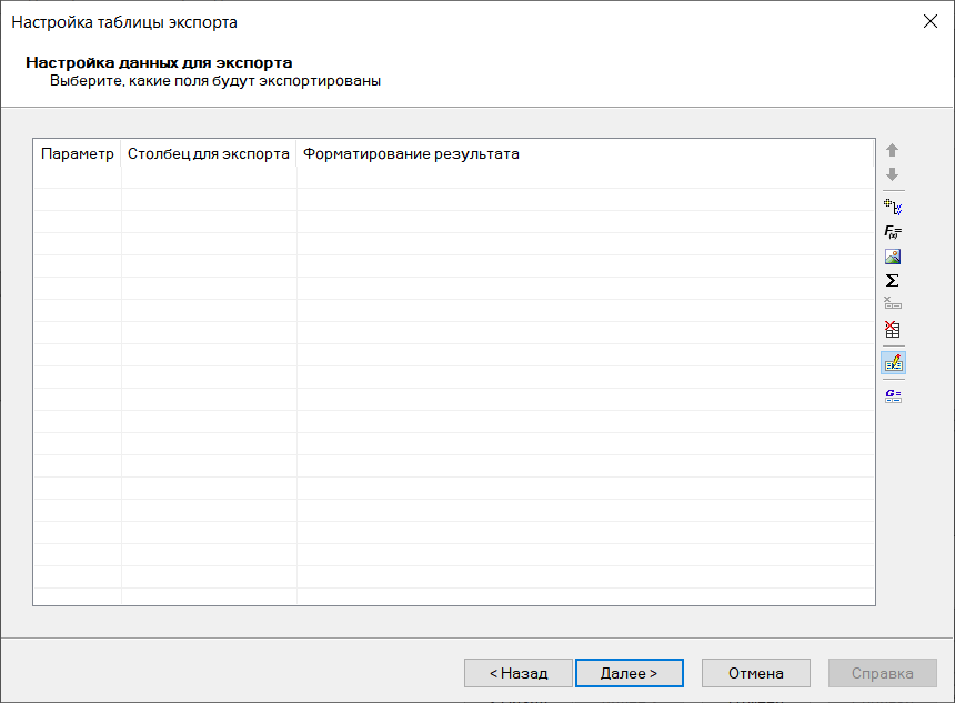 Нажмем Далее. Откроется окно Настройка таблицы экспорта (рис.11). В этом окне мы определим, какие именно информационные параметры и в каком формате будут отображаться в ячейках таблицы, а также по каким параметрам будет производиться группировка.