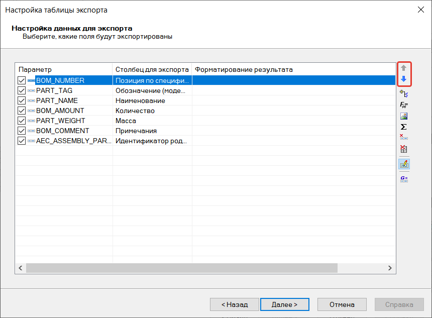 В столбце Параметр указываем свойство объекта, значение которого мы будем выводить в спецификацию, в Столбце для экспорта – название этого параметра.