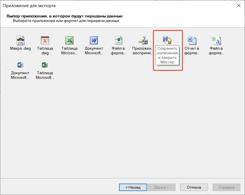Откроется окно Приложение для экспорта, где мы можем выбрать приложение, в которое будут переданы данные. В нашем примере мы настроили выборку данных для спецификации и пока не предполагаем ее выгрузку во внешние программы, поэтому выбираем Сохранить изменения и закрыть Мастер и нажимаем Готово.