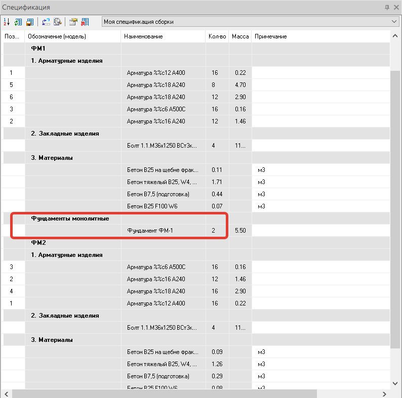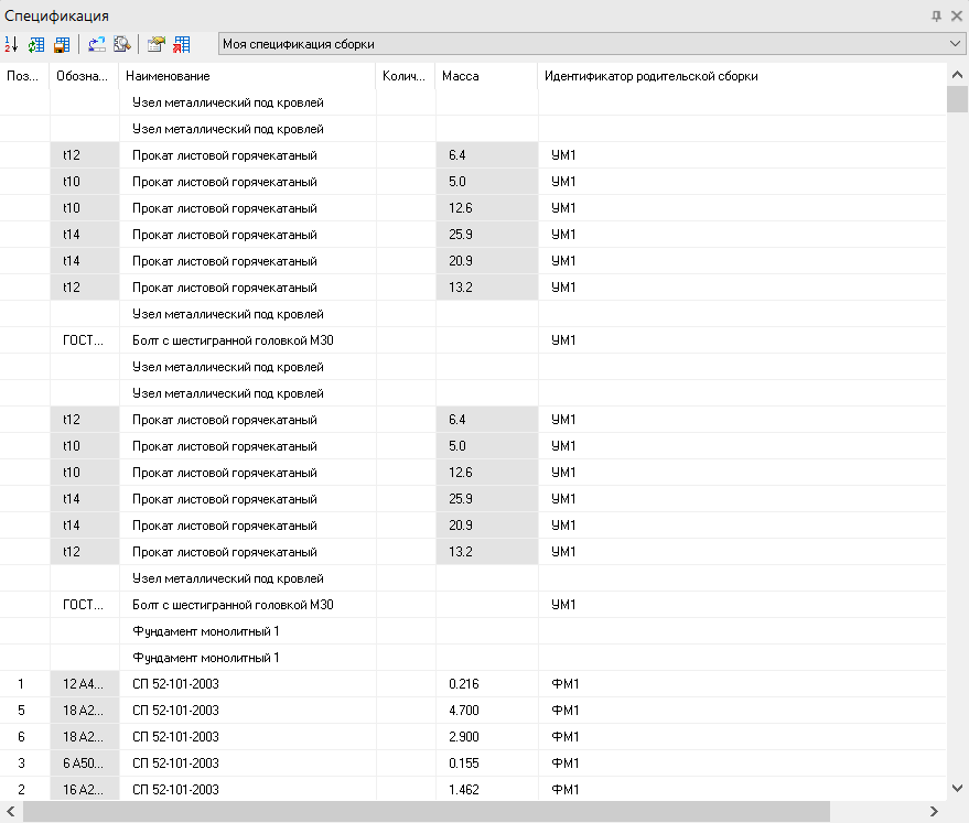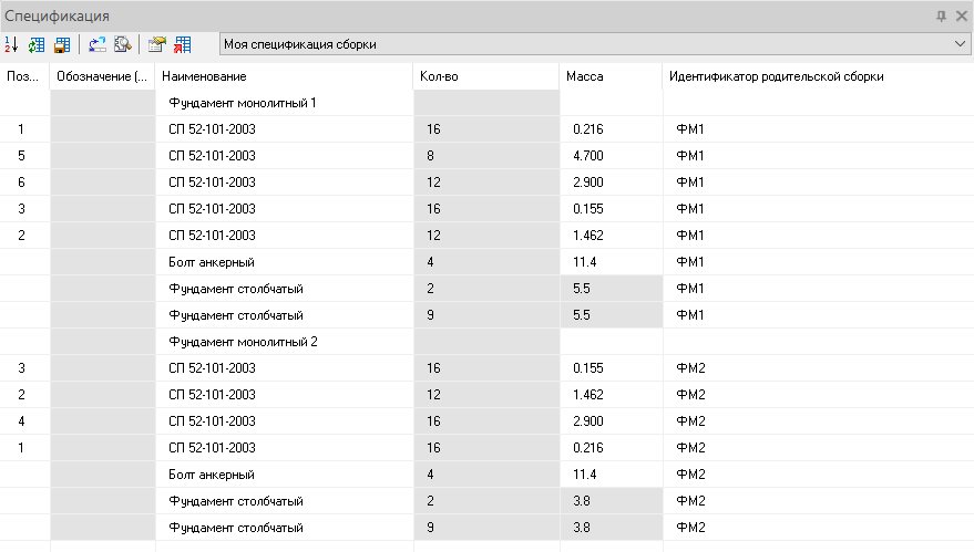 Теперь профиль Моя спецификация сборки появился на панели Спецификация. Однако отображаемые данные не соответствуют ожидаемому результату: позиции не проставлены, поле Обозначение заполнено, Идентификатор родительской сборки представлен в виде отдельно столбца, а не «заголовком» в столбце Наименование, столбец Количество единиц необходимо переименовать в Кол-во, также надо добавить группировку элементов и исключить из спецификации другие сборки, помимо фундаментов ФМ1 и ФМ2 (рис.17). Проведем дополнительные настройки спецификации.