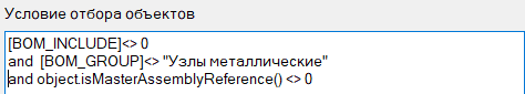 Вначале укажем условие, согласно которому в спецификацию будут попадать только те элементы, в свойствах которых определено, что их необходимо включать в спецификацию. В окне Условие отбора объектов введем [BOM_INCLUDE]<> 0 (т.е. параметр Включать в спецификацию не равен 0).