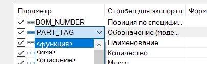 Поле Обозначение в нашем примере должно быть пустым. Для этого используем функцию[1]: выберем строчку с параметром Обозначение, откроем выпадающий список в столбце Параметр и выберем <функция>(Рис.21). В открывшемся окне Мастера функций вместо [PART_TAG] вводим “ ” (пробел между кавычками), нажимаем ОК. В результате в столбце Обозначение вместо вывода информации об объекте будет выводиться функция, которая будет выдавать пустое значение.