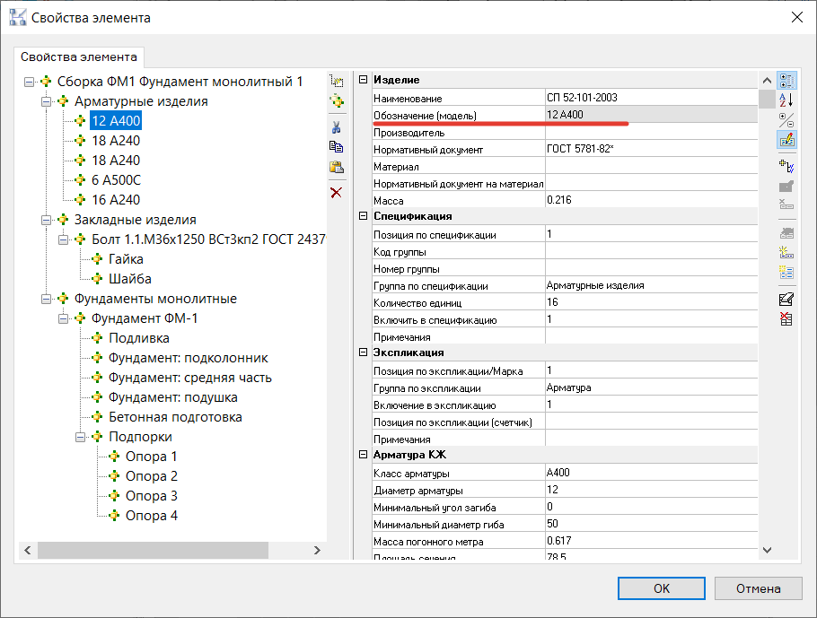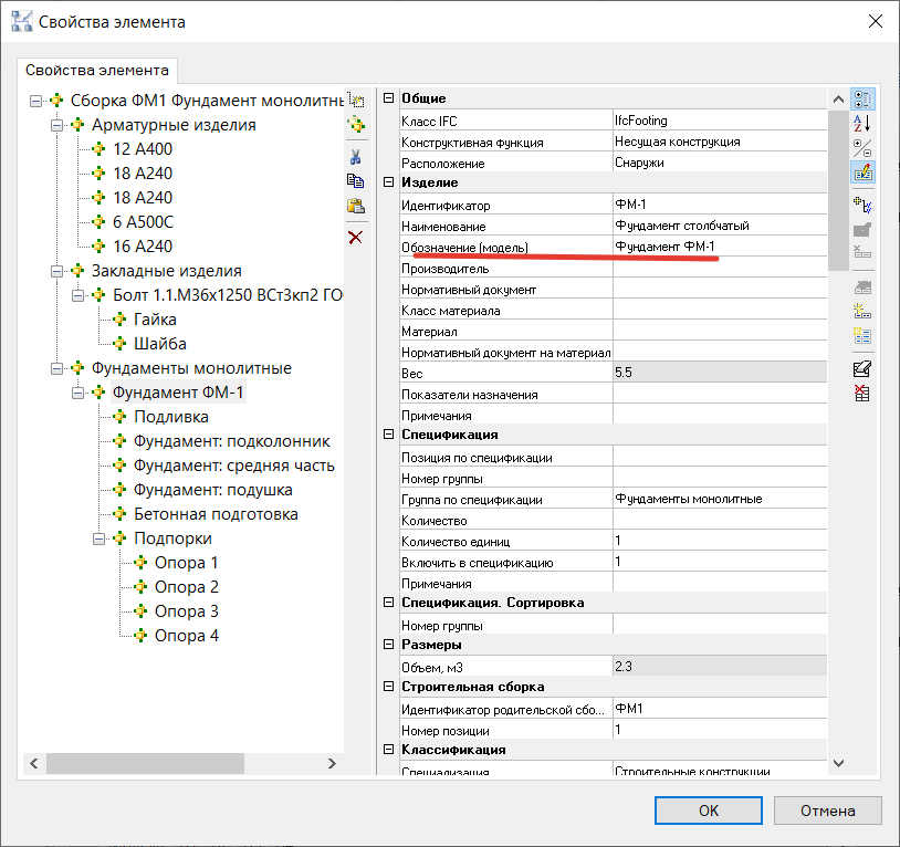 Чтобы понять, откуда приходит запись Фундамент ФМ-1, посмотрим на свойства специфицируемой сборки. Мы видим, что этот объект представляет собой запись верхнего уровня для монолитного фундамента, и, так как его свойства проходят все установленные нами фильтры, он попадает в спецификацию (рис. 36).