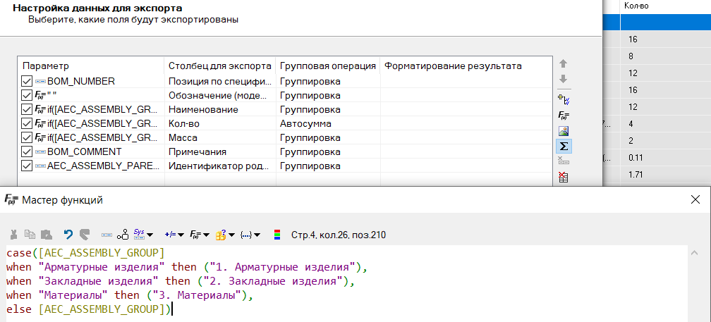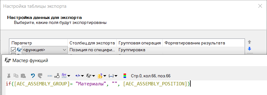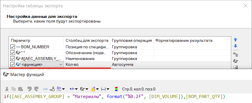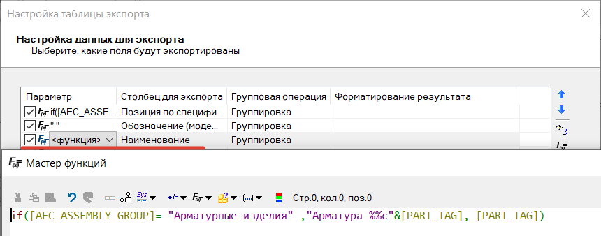 Чтобы создать разделы в спецификации и распределить по ним записи, добавим еще один параметр как функцию Для этого в окне Настройка данных для экспорта вызовем Мастера функций (рис.29) и введем туда следующую запись: