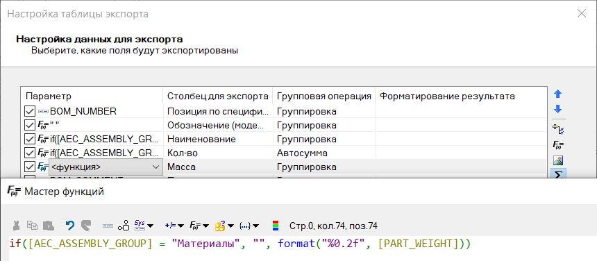 т.е. если Подгруппа сборки имеет значение Материалы, то оставить поле пустым, иначе вывести вес элемента с двумя знаками после запятой (рис.28).