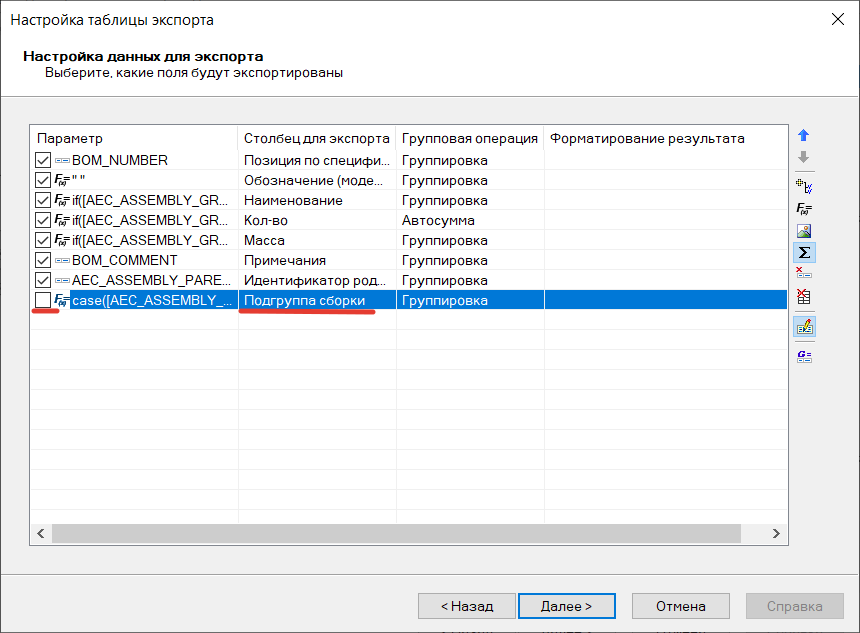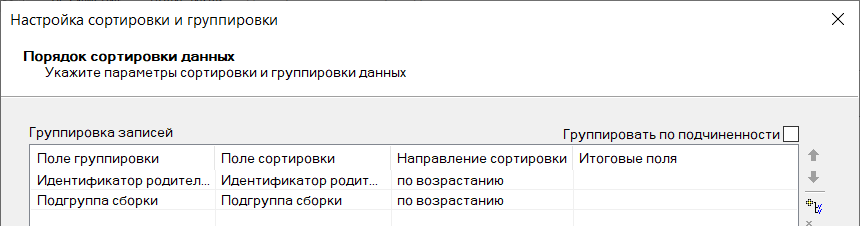 Данный параметр необходим нам для сортировки и группировки записей внутри спецификации, поэтому переименуем его для удобства в Подгруппа сборки и, убрав галочку слева от параметра, отменим его вывод на экран. Таким образом, параметр Подгруппа сборки будет оказывать влияние на структуру выборки, но не будет отображаться в качестве столбца с информацией (рис. 31).