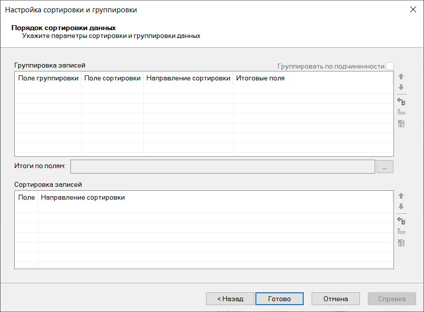 В этом окне мы определим правила, по которым будет осуществляться группировка и сортировка созданных и настроенных на предыдущем шаге параметров.
