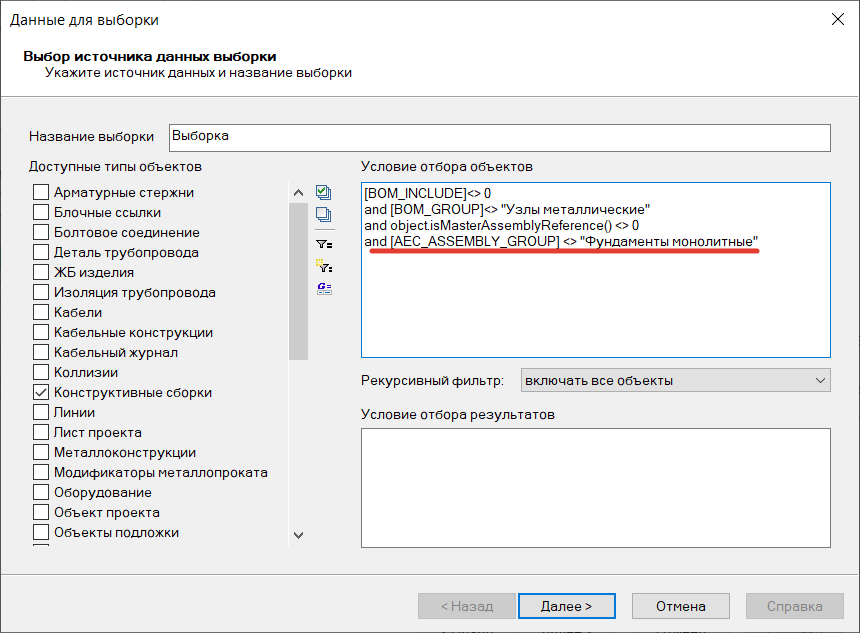 В форме Условие отбора объектов добавим условие, которое исключит из выборки металлические узлы [AEC_ASSEMBLY_GROUP]<> "Узлы металлические", болты, находящиеся в сборке УМ ([PART_TYPE]<> "Болт") ,а также применим лайфхак из прошлой статьи object.isMasterAssemblyReference() <> 0 для того, чтобы специфицировать только одно вхождение сборки в чертеж, а не все сразу.