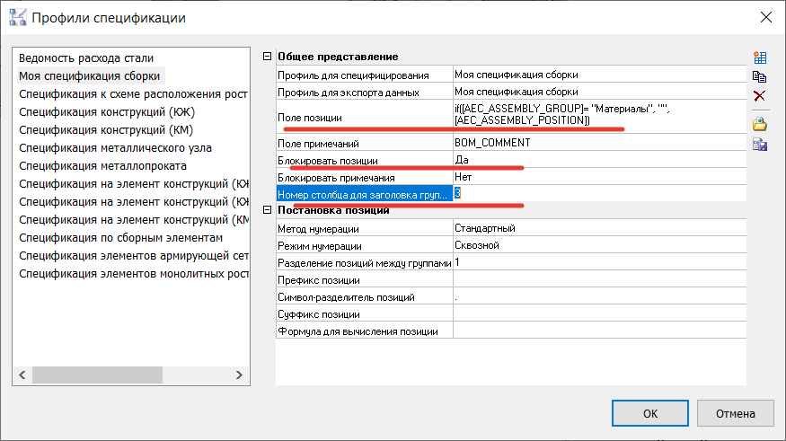 Чтобы изменить столбец, в котором отображаются заголовки разделов, и применить настройки, сделанные для поля Позиции, откроем настройки профиля спецификации.